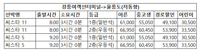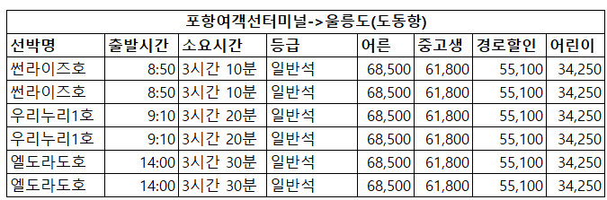 울릉도 배편 가격 비교는 다음과 같습니다.