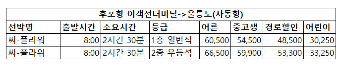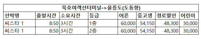 | 선박명 | 출발시간 | 소요시간 | 등급 | 어른 | 중고생 | 경로할인 | 어린이 |